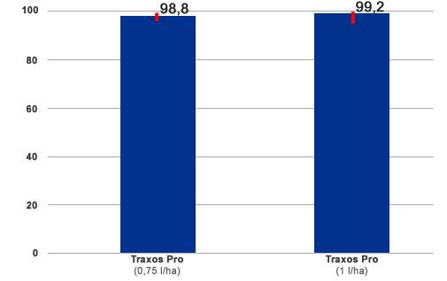 El siguiente gráfico muestra el porcentaje de control de Traxos Pro frente a Alopecurus spp. a las dosis mínimas y máximas de registro. Los resultados indican un control excelente sobre dicha mala hierba.