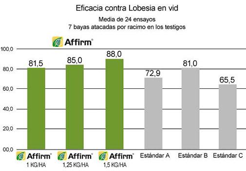 AFFIRM es altamente eficaz contra la polilla de la vid (Lobesia botrana). Como muestra la gráfica, los numerosos ensayos realizados muestran resultados consistentes a dosis entre 1 y 1,5 Kg/ha.