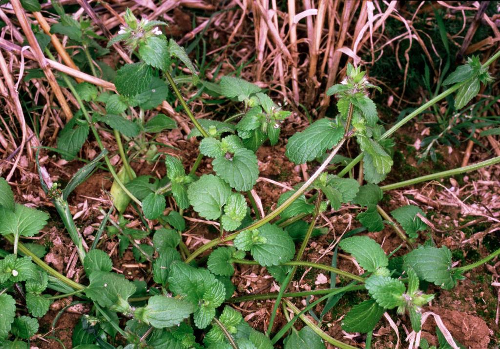 Altura: 10 a 40 cm. Planta totalmente velluda. Tallo cuadrado, rojo violáceo, porte erguido. Hojas: ovales, más alargadas hacia el ápice, crenadas a dentadas, cordiformes, pecioladas y luego se hacen sésiles hacia el ápice. Nervaduras profundas, aspecto abollonado. Color verde oscuro, a veces rojizo. Inflorescencias: verticilos florales en la axila de las flores y rodeándolas. Pequeñas flores rosadas cuya corola sobrepasa poco el cáliz. Grandes sépalos violáceos. Piezas florales peludas.