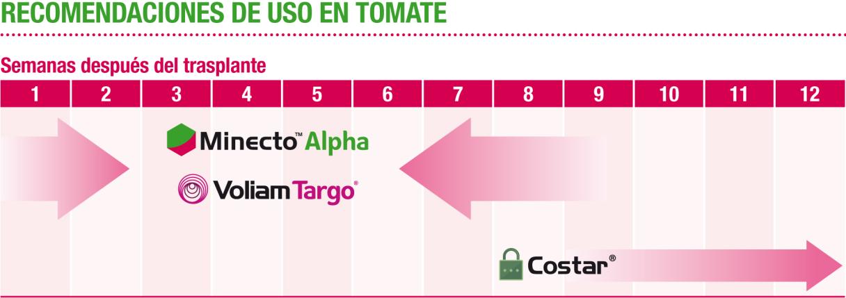 Minecto Alpha en el cultivo de tomate puede ser aplicado vía riego o vía foliar a lo largo del ciclo de cultivo. En ambos tipos de aplicaciones, Minecto Alpha proporciona una excelente eficacia contra ninfas y adultos de mosca blanca y trips.